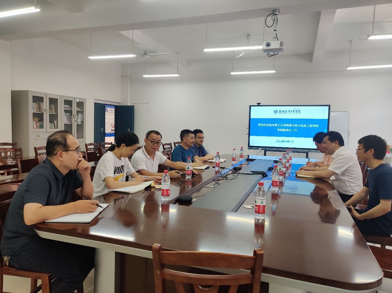 6月7日下午,桂林理工大学物理与电子信息工程学院副院长李明等一行三人莅临必赢76net线路唯一官方网站参观交流,必赢76net线路唯一官方网站副院长吴果林以及部分教师热情接待了来访嘉宾,并与来访嘉宾在巡天楼404会议室举行了物理教学工作经验交流会。交流会由吴果林副院长主持。