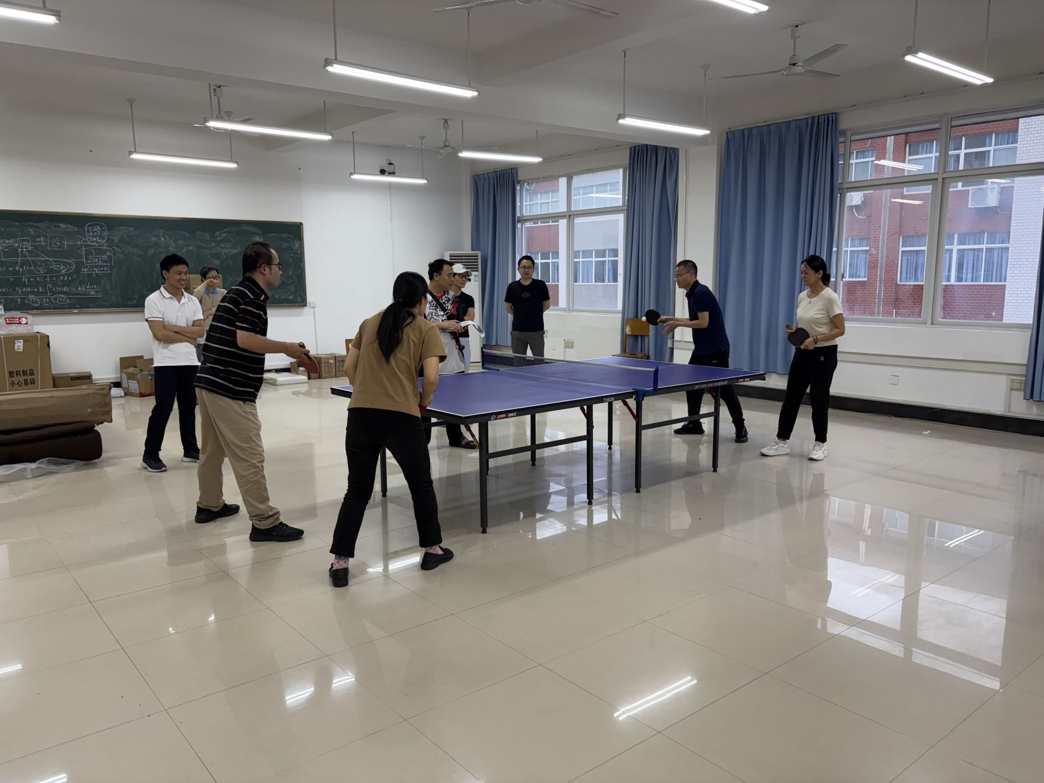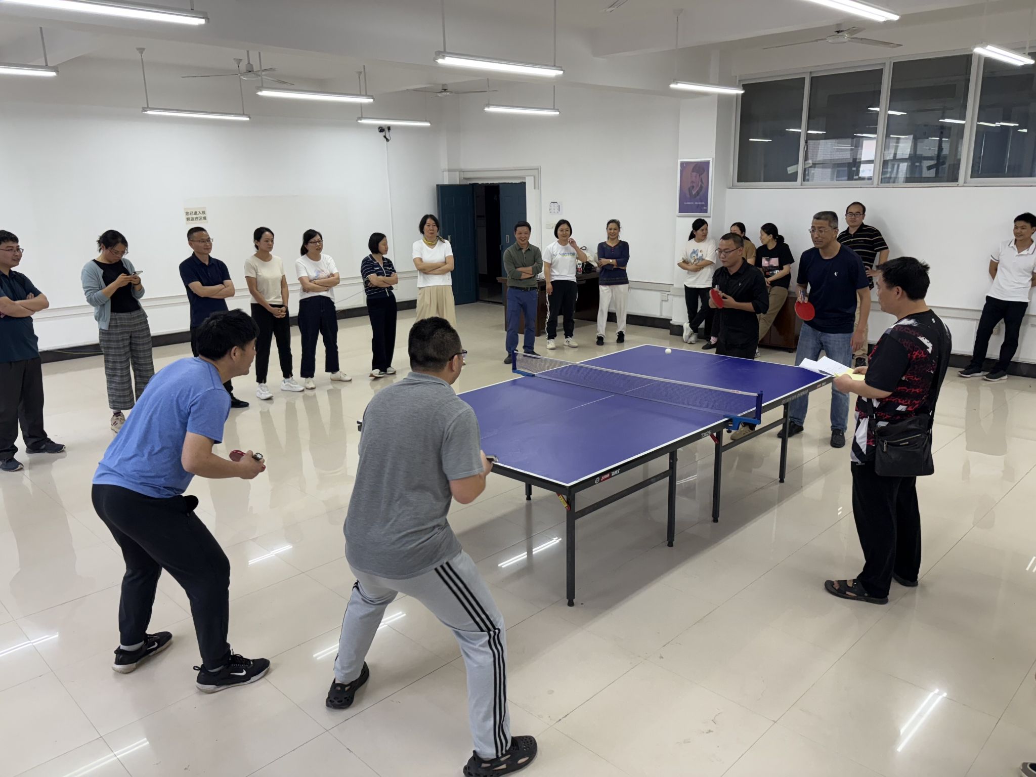 比赛现场,参赛教师们精神饱满,挥拍间尽显活力。发球抢攻、弧圈对拉、削球防守……精湛的球技引得观众阵阵喝彩。物理教研室团队配合默契,攻防转换流畅,最终以强劲实力夺冠;数据科学教研室稳扎稳打,战术灵活,荣获亚军;高数教研室与院办队伍同样表现亮眼,并列第三名。