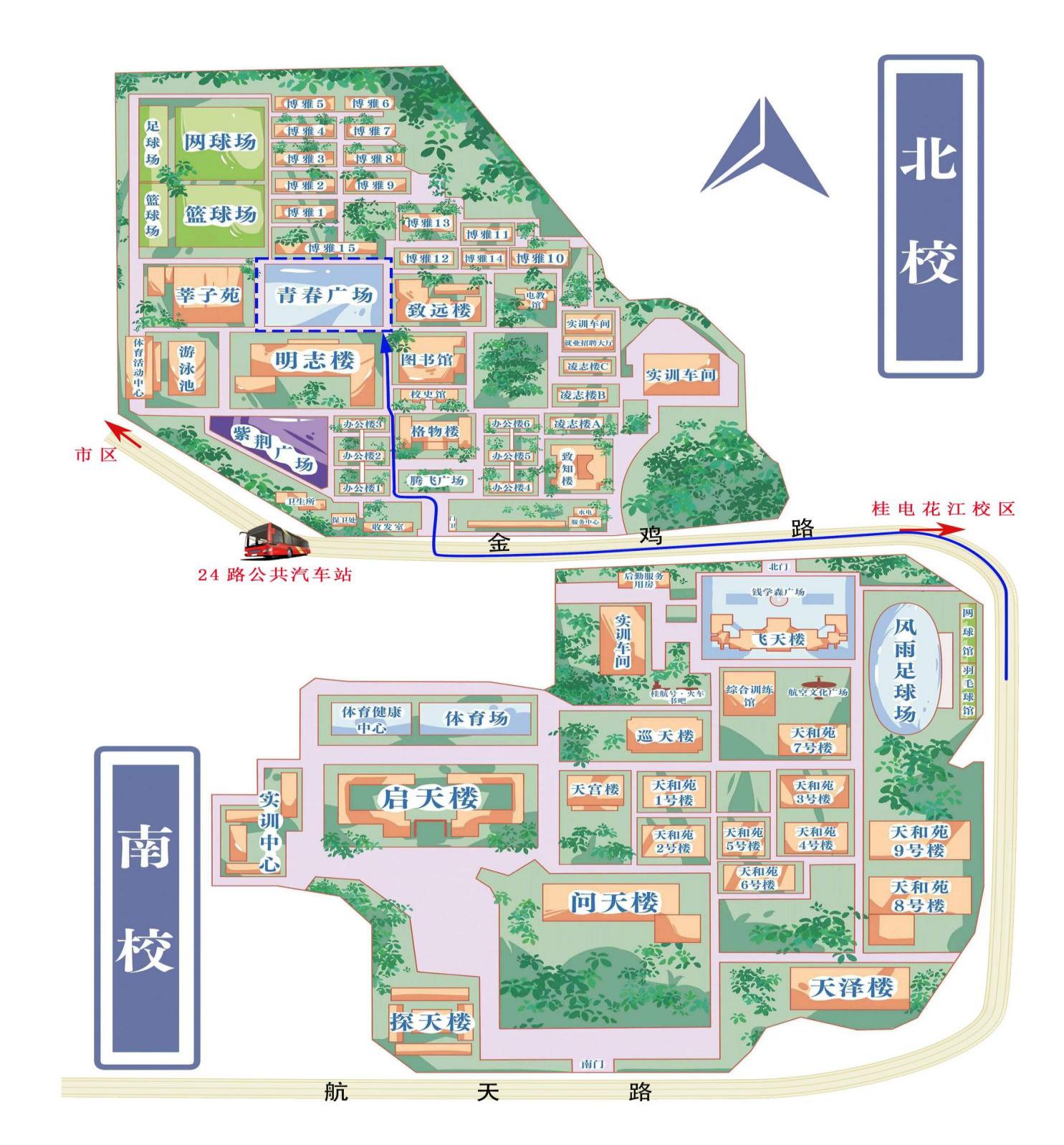 (二)可分别从桂林市金鸡路2号、航天路进入北校区。